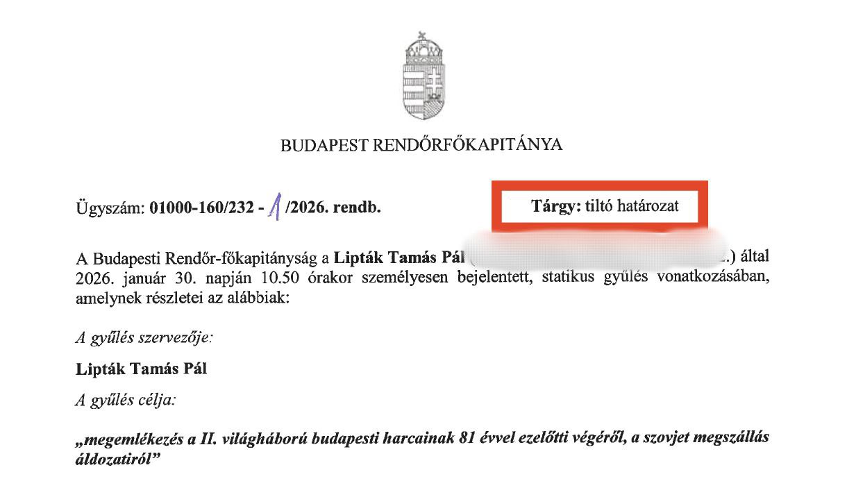 Van azonban másban. A képen egy két héttel ezelőtti tiltó határozat látható. Szerettem volna ugyanis gyűlést szervezni, amelyen a II. világháború budapesti harcainak végére emlékeztem volna. Nem magamtól találtam ki a megfogalmazást, azt ugyanis a Magyar Ellenállók és Antifasiszták nemrég véget ért megemlékezésétől kölcsönöztem.